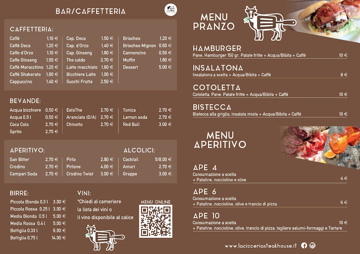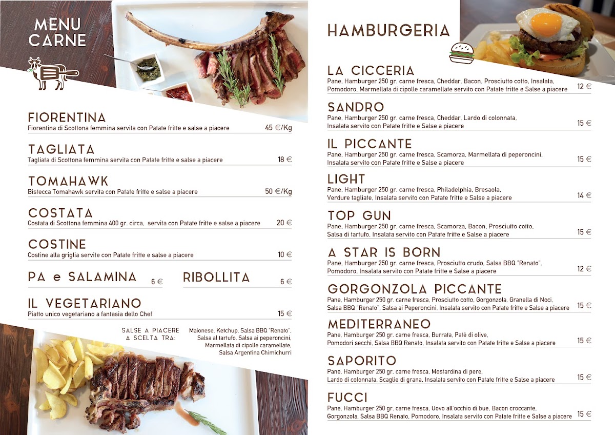 La Cicceria - Steak House offers a diverse and flavorful menu, catering to various tastes and occasions. For lunch, they offer a convenient Pranzo di lavoro menu, ideal for a quick yet satisfying meal. On Thursday evenings, guests can indulge in their special Menu FIORENTINA, featuring a traditional Tuscan-style steak, or the hearty Menu COSTATA, highlighting the tender and flavorful costata. On Sundays, the Menu SPIEDO takes center stage, offering a delicious variety of skewered meats, perfect for a leisurely family gathering. Additionally, during special occasions like Natale 2022, La Cicceria offers festive menu options that reflect the holiday spirit. Each dish is carefully crafted to provide an authentic Italian steakhouse experience, with a focus on high-quality meats and traditional cooking methods.