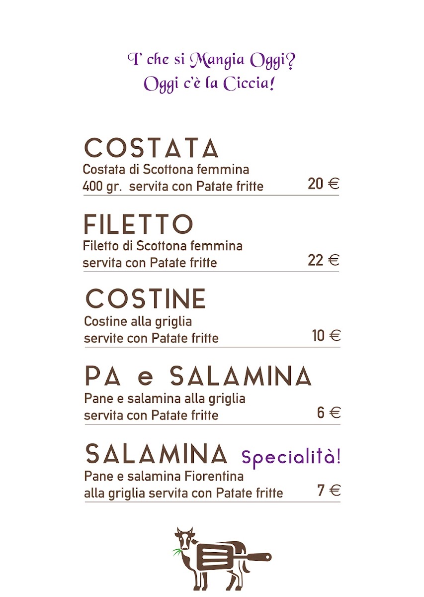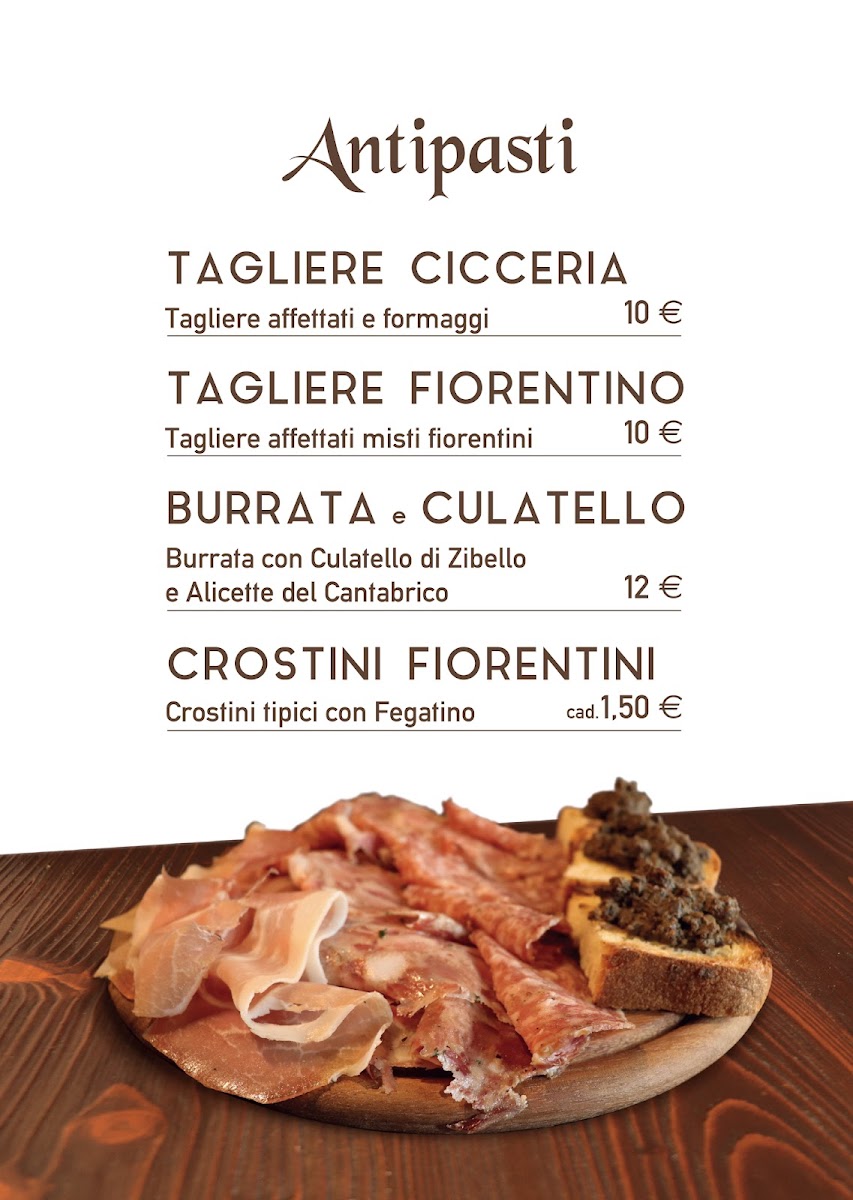 . tagliere assaggi fiorentini . 1kg di bistecca alla fiorentina con contorno di patate fritte . calice di vino o boccale di birra . acqua, caffè e dolce Il menu è per 2 persone