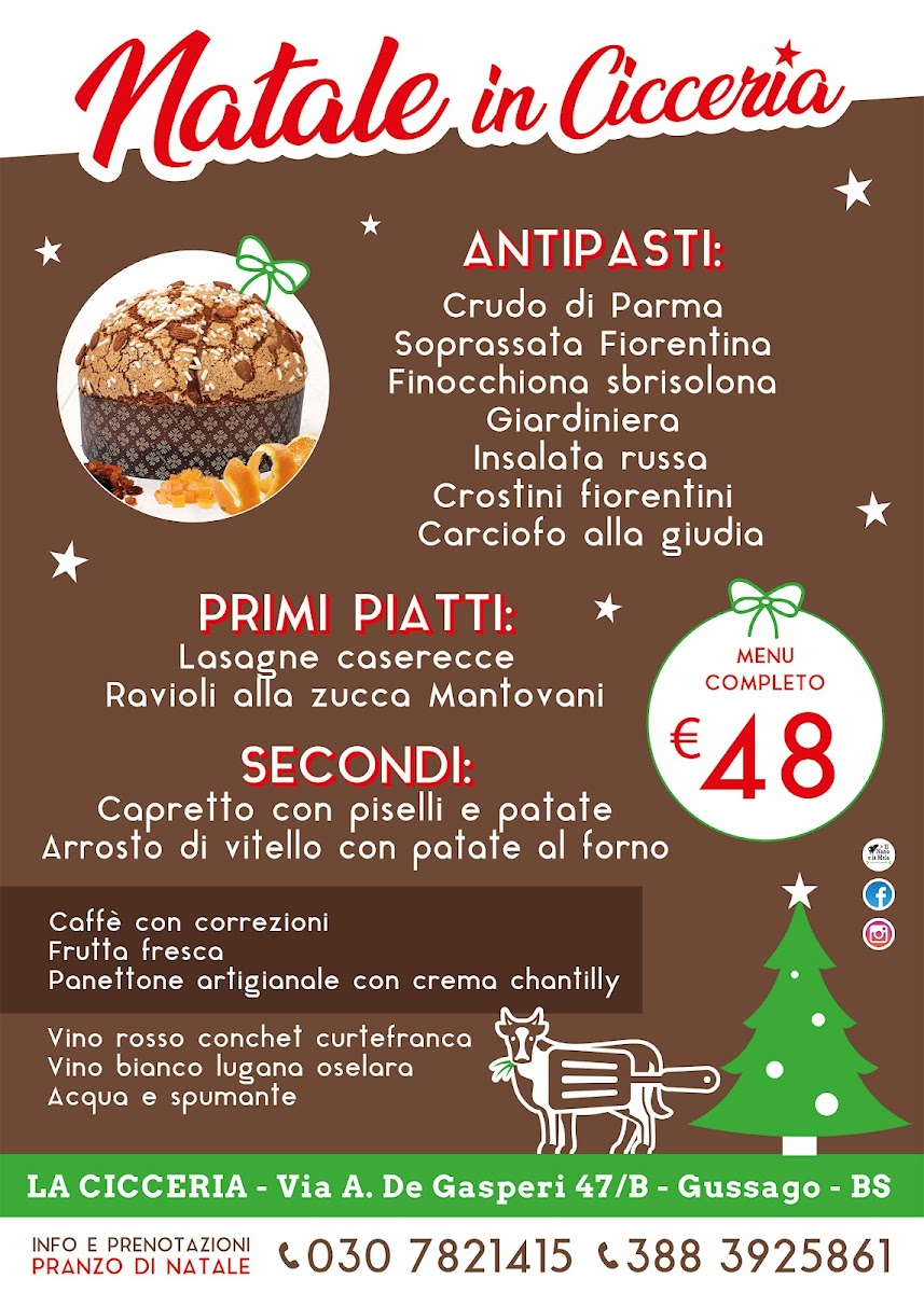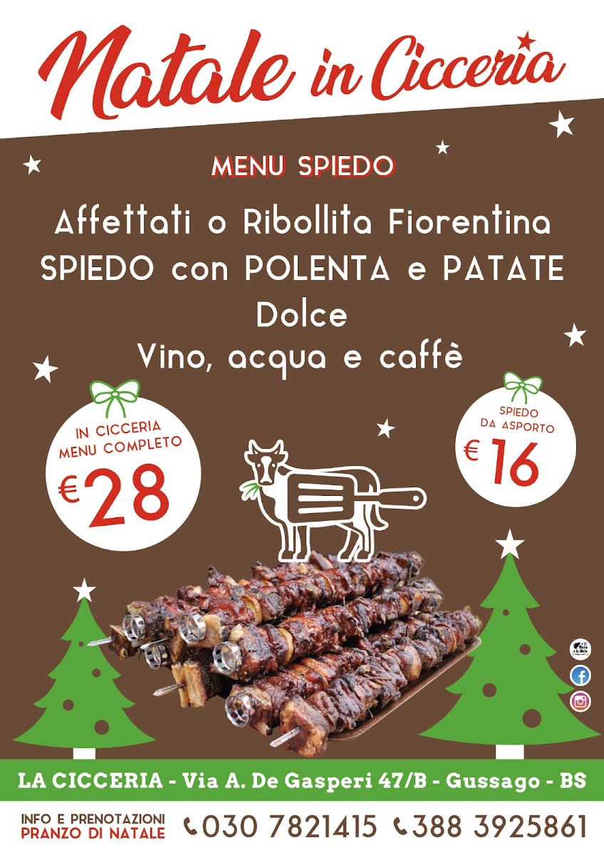 ????NATALE IN CICCERIA???? Per questo Natale abbiamo pensato ad uno dei nostri piatti forti della domenica: lo spiedo! Come sempre puoi sederti ad uno dei nostri tavoli, oppure comodamente a casa tua! ????MENU COMPLETO (in Cicceria) € 28 . Affettati o ribollita fiorentina . Spiedo con patate e polenta . Dolce .Acqua, vino e Caffè ????MENU D'ASPORTO € 16 . Spiedo con patate e polenta