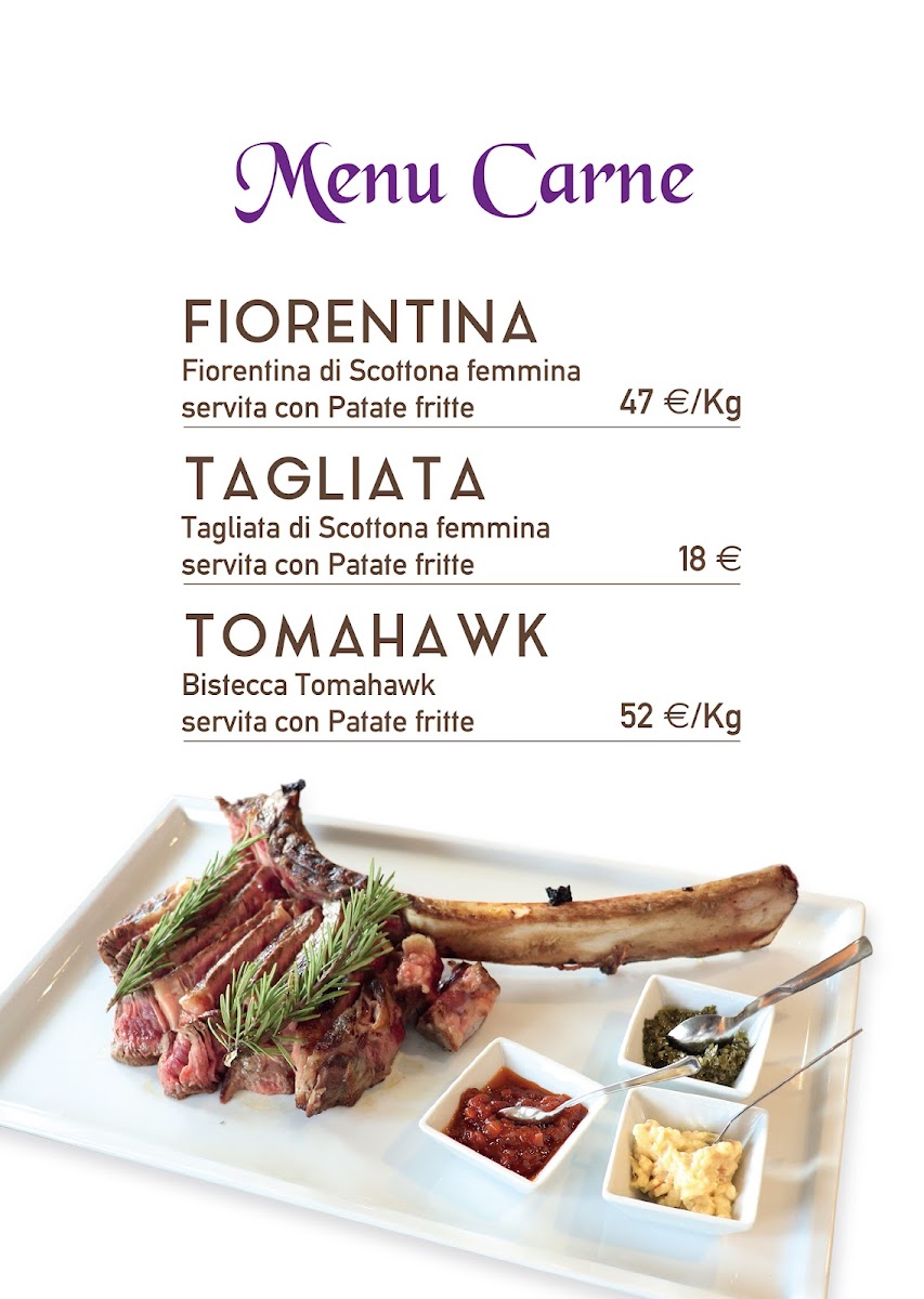 . tagliere assaggi fiorentini . 1 costata di scottona da 400gr. cad con contorno di patate fritte . calice di vino o boccale di birra . acqua, caffè e dolce Il menu è per 2 persone